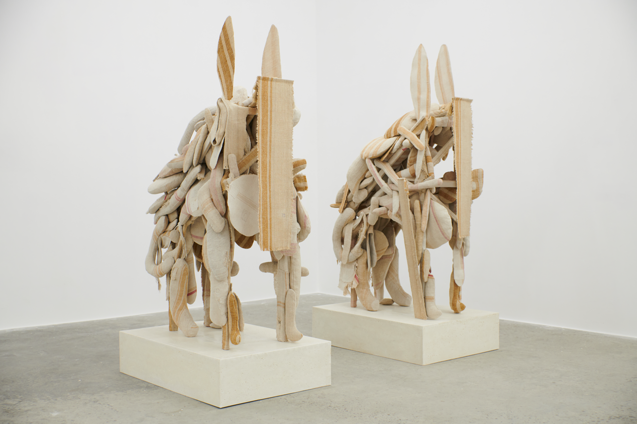The artist pays special attention to the history and processes each material undergoes: textiles, hay, wood, stone, or ash. The monsters of our collective imagination become, in his work, both psychopomp creatures—which accompany the souls of the dead—and companion animals, whose sculptural power is imposing and protective.